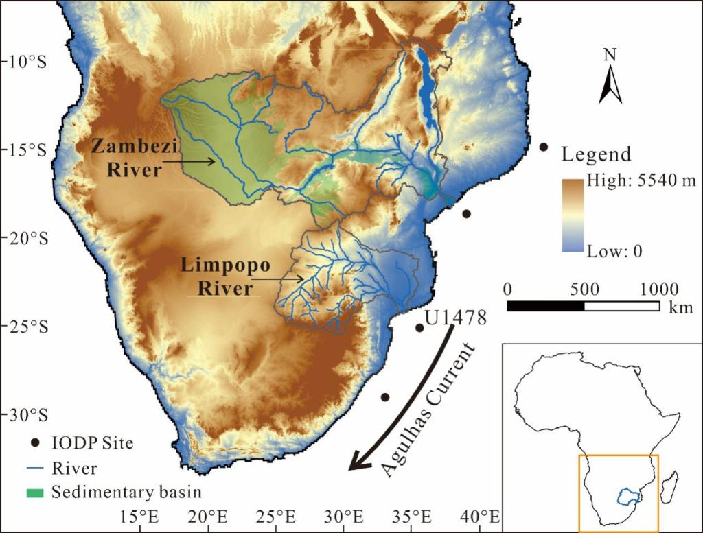 该研究以非洲南部林波波河为对象,综合运用Sr-Nd-Hf同位素、重矿物组合和碎屑锆石U-Pb年代学等多指标物源示踪方法,并结合赞比西河及其他全球典型大河对比,系统揭示了大型河流沉积物从源区到河口及海洋的输运过程与控制机制(图1)。研究表明,林波波河边缘海沉积物主要来源于中游陡坡河段;进一步对比发现,不同大型河流沉积物输运模式与河流纵剖面形态密切相关,其中阶梯状纵剖面的河流更容易表现出由邻近河口的陡坡河段主导沉积物输入的特征。