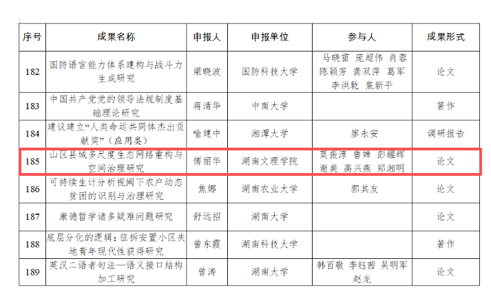 12月25日,湖南省省委办公厅公布第十六届社会科学奖评选结果,我院傅丽华教授的成果《山区县域多尺度生态网络重构与空间治理》荣获三等奖。此次获奖是我院在社科研究领域的重大突破,标志着学院在特色学科建设与应用研究方面取得显著进展,同时填补了我院近年来社科成果奖的空白。湖南省社会科学奖作为我省社科领域的最高奖项,评选标准严苛。傅丽华教授的成果能够成功获奖,充分彰显了其深厚的学术功底与研究成果的高质量。