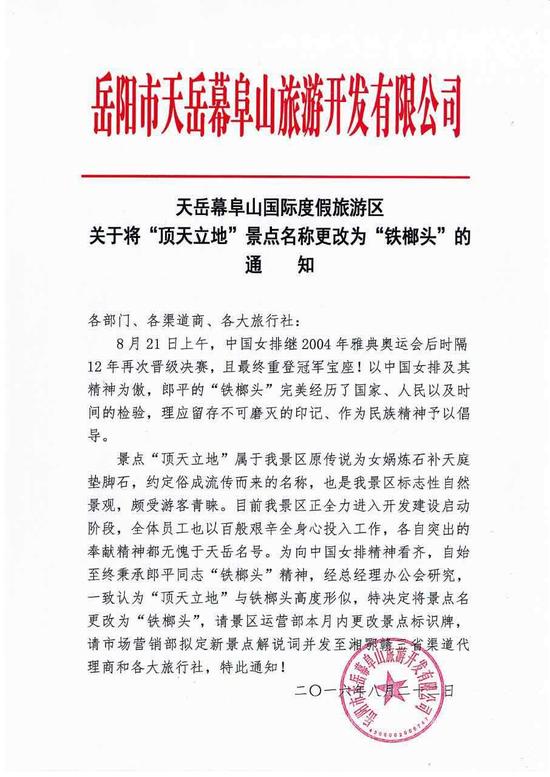 “景点‘顶天立地’属于我景区原传说为女娲炼石补天庭垫脚石,约定俗成流传而来的名称,也是我景区标志性自然景观,颇受游客青睐,目前我景区正全力进入开发建设启动阶段。全体员工也以百倍艰辛全身心投入工作,各自突出的奉献精神都无愧于天岳名号。为向中国女排精神看齐,自始至终秉承郎平同志‘铁榔头精神’,总经理办公室研究,一致认为‘顶天立地’与铁榔头高度形似,特决定将景点名更改为‘铁榔头’,请景区运营部本月内更改景点标志牌,请市场营销部拟定新景点解说词,并发至湘鄂赣三省渠道代理商和各大旅行社,特此通知!”