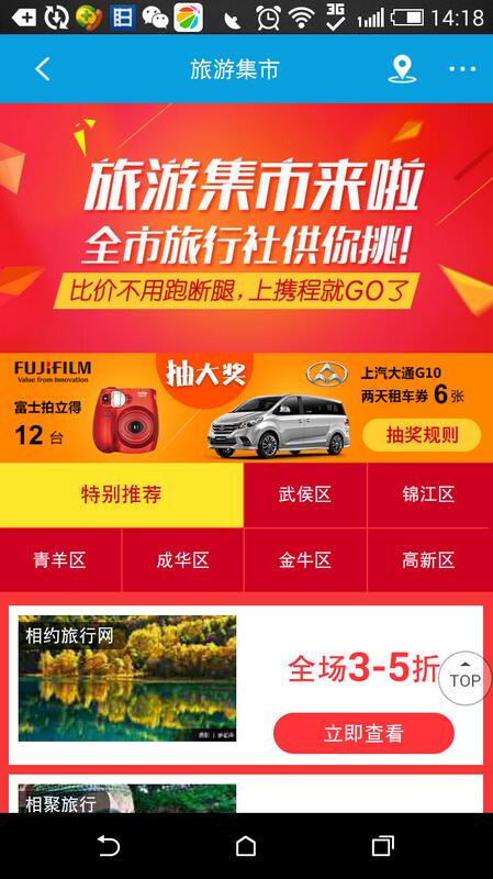 据悉,首批门店、旅游顾问已经在携程APP上线,同时本市百家旅行社联合投入补贴,上线手机上的“成都旅游集市”,推出国内游、出境游5折起大型优惠活动。