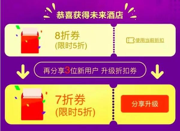 新用户“8折限时5折”只是第一阶段,新用户只需将活动页面分享给3个好友,如果对方也是新用户并成功领取红包,自己的红包就能升级为“7折限时5折”红包。