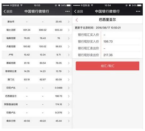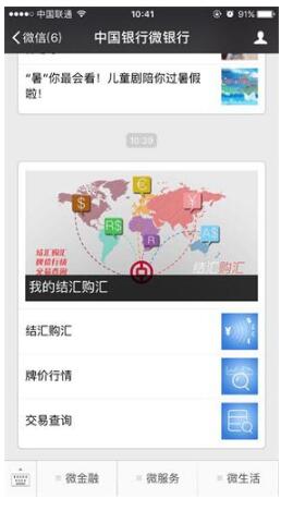 为了体验快速兑换巴西雷亚尔,笔者关注了“中国银行微银行”公众号。进入公众号后,在“微金融”菜单下找到“我的结汇购汇”子菜单,点击后即可收到包含“结汇购汇”、“牌价行情”、“交易查询”三个选项,以及“我的结汇购汇”介绍文章的多图文信息。