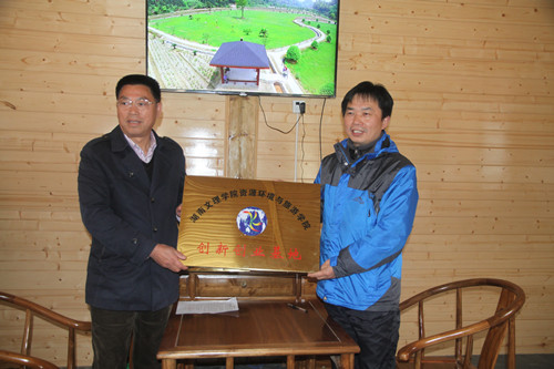 我院院长彭保发教授与湖南乌云界生态旅游开发有限公司董事长卢玺帆分别代表合作双方签署产学研合作协议书。卢玺帆董事长同时授于我院为人才培养基地;院长彭保发授于湖南乌云界生态旅游开发有限公司为创新创业基地