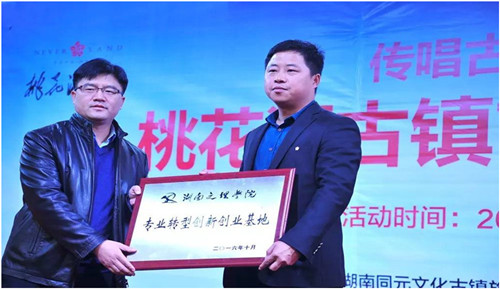 10月29日下午,桃花源古镇与我院大学生创新创业基地签约及授牌仪式,在桃花源古镇高士广场隆重举行。这是继2015年10月11日,湖南同元公司与我校达成产学研校企合作之后的一次实质性深化合作,开启了技能培训、校企合作、就业创业、旅游创意等方面崭新篇章。