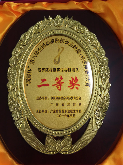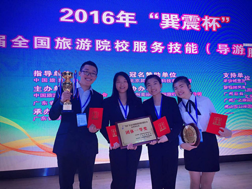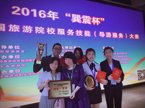 国家旅游局办公室巡视员刘士军,中国旅游协会副会长兼秘书长张润钢,广东省旅游局党组副书记、副局长张振林,中国旅游协会旅游教育分会会长、中山大学研究生院、旅游学院院长保继刚,中国旅游协会旅游教育分会副会长、北京大学旅游研究与规划中心主任吴必虎等领导嘉宾出席了大赛的开、闭幕式活动并为获奖选手颁奖。我院李晓丹、邵晓慧老师带领普通话组和英语组共4名同学参赛,经过激烈角逐,全力拼杀,全部获奖,其中14级旅游管理专业陈志城同学获得高等院校组普通话讲解服务一等奖,14级旅游管理专业粟彩凤同学获得高等院校组普通话讲解服务三等奖,13级旅游管理专业唐小妹同学获得高等院校组英语讲解服务二等奖,14级旅游管理专业陈蓉同学获得高等院校组英语讲解服务三等奖,我校同时获得了高等院校组团体一等奖。