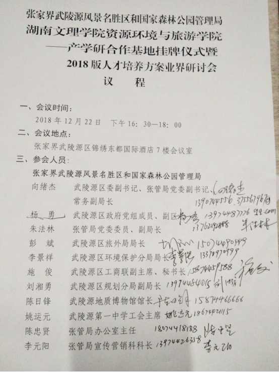 武陵源区委区政府及张管局高度重视本次双方的产学研合作启动及人才培养方案研讨,百忙之中派出了武陵源区委副书记、张管局党委副书记常务副局长向绪杰,武陵源区副区长杨勇,张管局党委委员、副局长朱法林,武陵源区旅游外事侨务局局长彭斌,武陵源区环境保护局局长李景强,武陵源区工商联副主席、秘书长施俊,武陵源区规划局副局长刘湘勇,武陵源地质博物馆馆长陈日锋,武陵源区第一中学工会主席姚运元,张管局办公室主任陈忠贤,张管局宣传营销科科长李元阳,张管局风景名胜管理科科长李伟,张管局组织人事科副科长阳丹等13位领导出席本次活动。