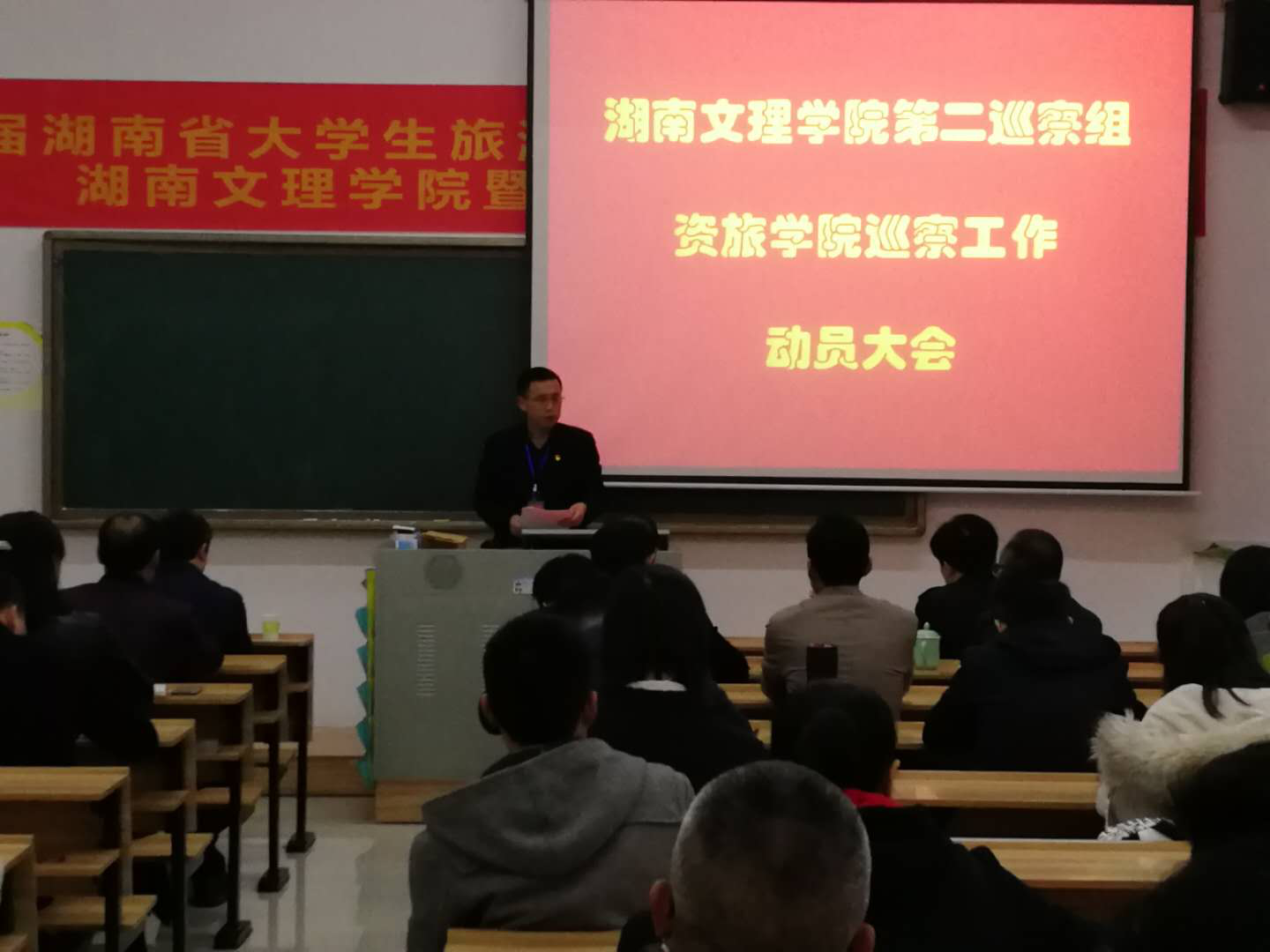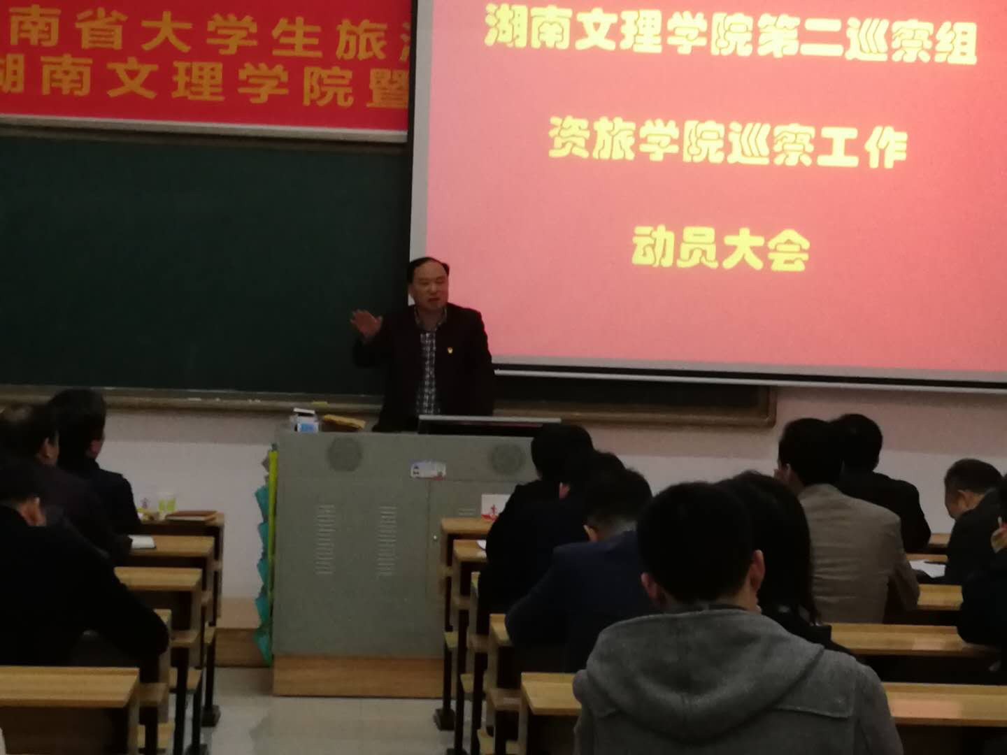 4月2日下午,湖南文理学院党委巡察督查办第二巡察组进驻我院并召开巡察工作班子见面会和动员大会。校党委委员、副校长李大平,校党委委员、纪委书记曾言,校党委巡察督查办主任刘曙东,第二巡察组组长徐秋林,巡察专员向绪忠、何忠祥、李春桂、吴大夫,联络员姚丹等出席。大会由学院院长彭保发主持,党总支书记郭兴体、副院长吴云超、党总支副书记郭婧、专职组织员肖杰平和全院教职工及在校的全体学生党员参加了动员大会。