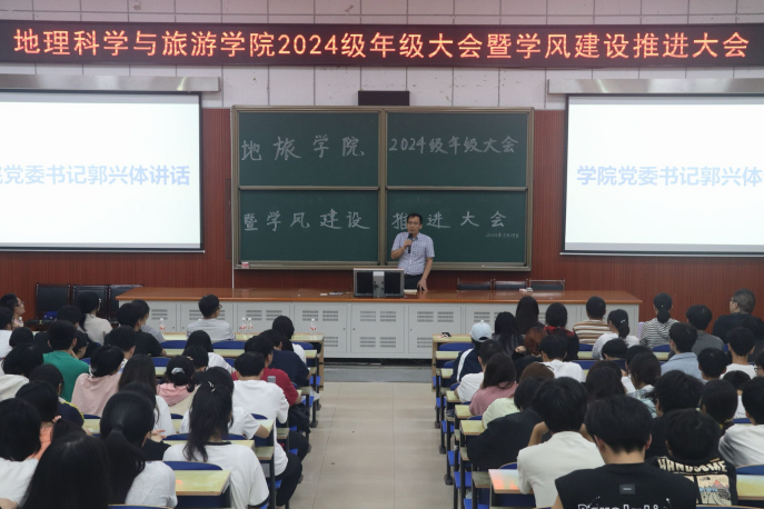 2025年9月24日晚7点,地理科学与旅游学院在第三教学楼D101教室召开2024级年级大会暨学风建设推进大会。学院党委书记郭兴体、副院长夏汉军、副院长罗增、24级班主任及学工办黄倩辉、杨雅、蔡薇等老师出席会议。