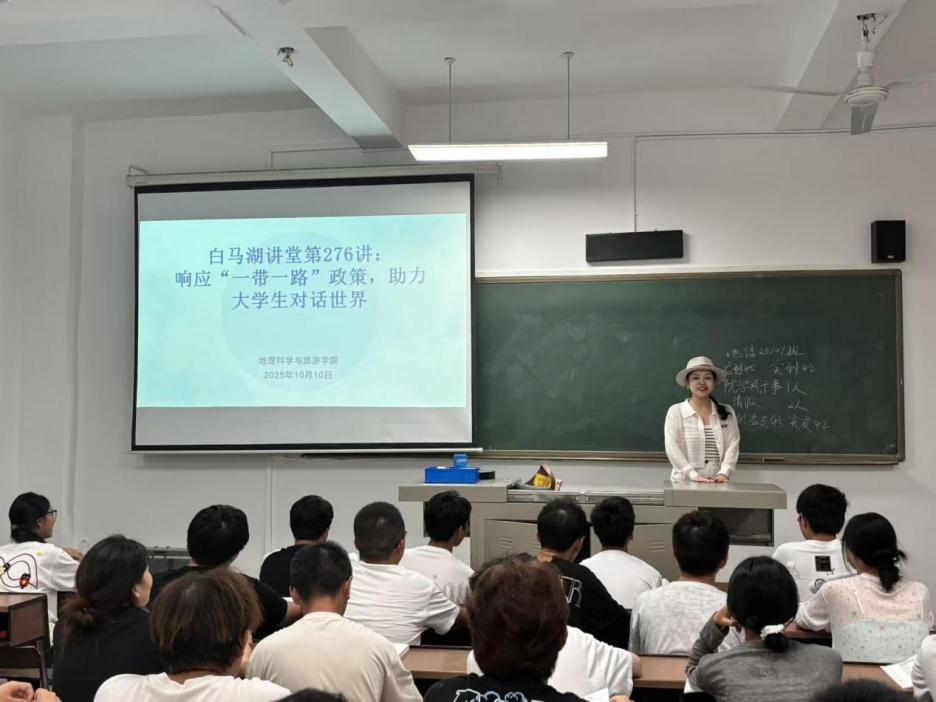 2025年10月10日19:00,地理科学与旅游学院在东校区第二实验楼A203举办白马湖就业讲堂第276讲,特邀路文婷校长、于艺彩老师主讲,围绕“响应‘一带一路’政策,助力大学生对话世界”主题,为学生解析职业发展路径。