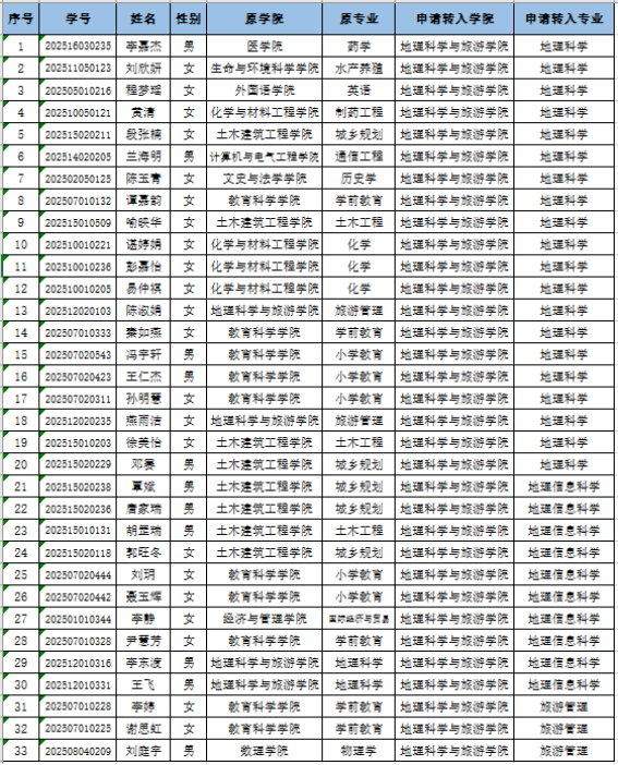 地理科学与旅游学院关于2025级第一学期学生转专业面试资格审查结果公示