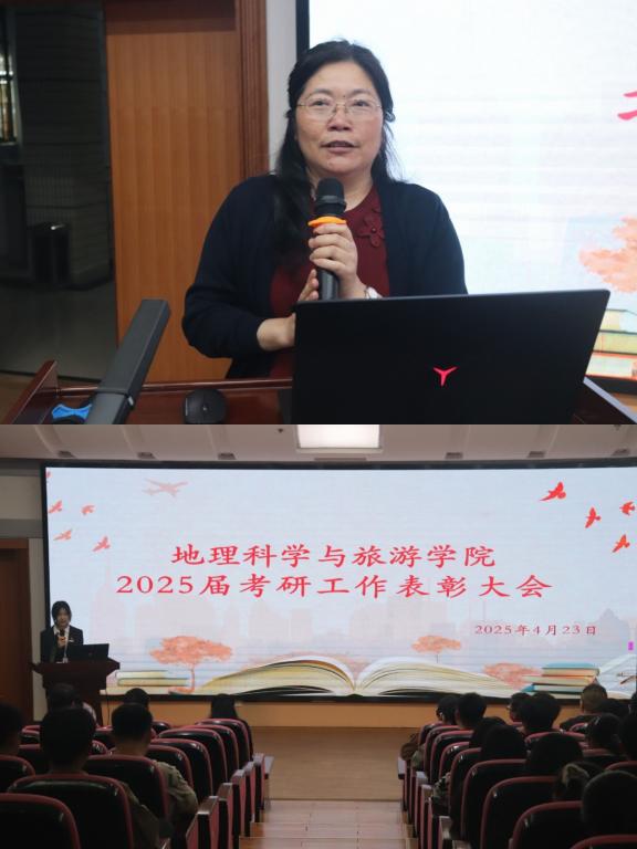 2025年4月23日晚7:00,地理科学与旅游学院在图书馆报告厅举行了地旅学院2025届考研工作表彰大会、地旅学院2026届考研班开班仪式暨考研经验交流会。地旅学院党委书记郭兴体、院长傅丽华、党委副书记齐英、考研指导老师、21级优秀考研学子以及部分22级考研备考学子参与此次会议。