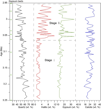 针对“更多降水是否会使内陆干旱区在该温暖期进入湿润状态”的问题,罗增博士团队进一步分析了甘森剖面的古湖泊沉积样品,构建了该剖面的蒸发岩记录,并结合岩性特征展开验证。结果显示,尽管柴达木盆地当时降水有所增加,但剖面中仍发育大量石膏与石盐——这一典型蒸发岩矿物组合,指示该区域仍处于干旱环境。该发现表明,未来全球变暖可能带来的降水增加,或无法在短期内逆转我国西北内陆的干旱化现状。