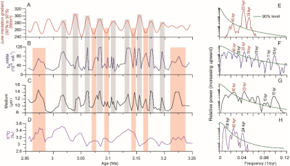 晚上新世气候适宜期(3.264-3.025 Ma)是距今最近的持续温暖气候期,其气候特征被认为与未来气候具有相似性。为重建该时期东亚夏季风的降水变化,我院罗增博士团队以柴达木盆地甘森剖面为研究对象,基于该剖面3.25-2.95 Ma的高分辨率磁学指标记录,开展了系统研究。结果显示,该剖面的降水记录呈现出2万年与4万年的轨道周期,这与我国黄土高原地区降水记录的周期完全一致,表明两地降水均受太阳辐射与冰盖变化的共同驱动。据此研究团队提出:柴达木盆地与黄土高原一致的降水周期变化,证明东亚夏季风不仅是黄土高原降水的主要来源,也对柴达木盆地的降水产生影响。这一结论首次在轨道尺度上,证实柴达木盆地在晚新世气候适宜期的降水受东亚夏季风调控。